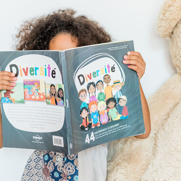 «Diversité» is one of nine books by Pomango in the Collection Pour Bien Grandir. Forty-four differences are illustrated and explained in order to instill in mini an openness to the differences between people, cultures and points of view. This caring attitude of open-mindedness ensures that we have an interest, curiosity and understanding for ideas that are partly or totally different from our own. Being benevolent, listening to others and respectful of the opinions of others are qualities that stem in part from this quality of open-mindedness.