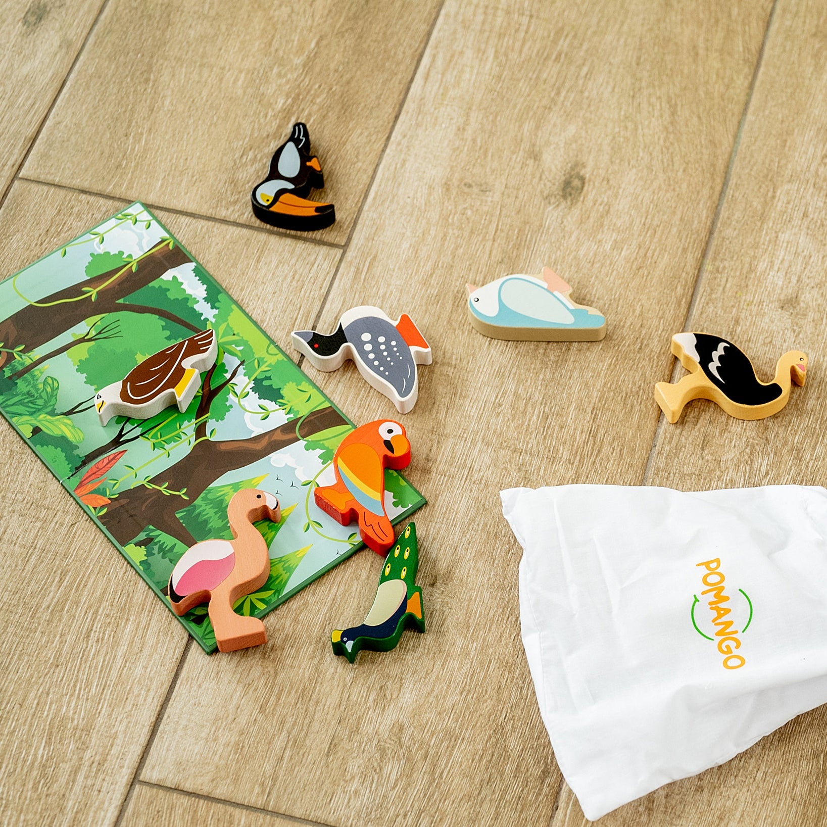 Each set consists of 8 wooden animals, painted with non-toxic paint, a convenient storage/carrying bag and a game board for an immersive play experience.