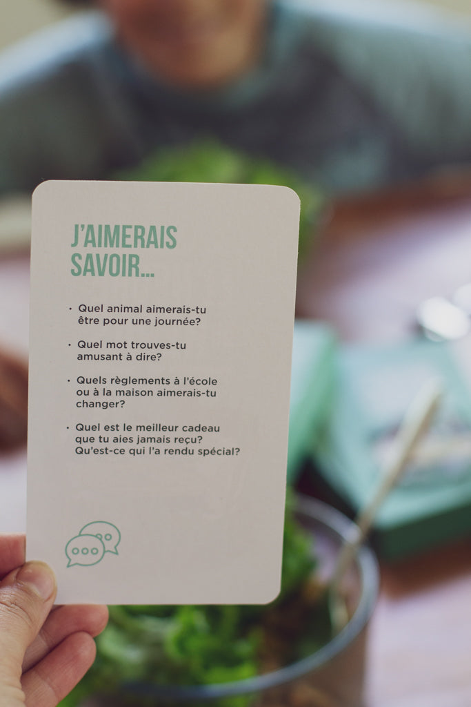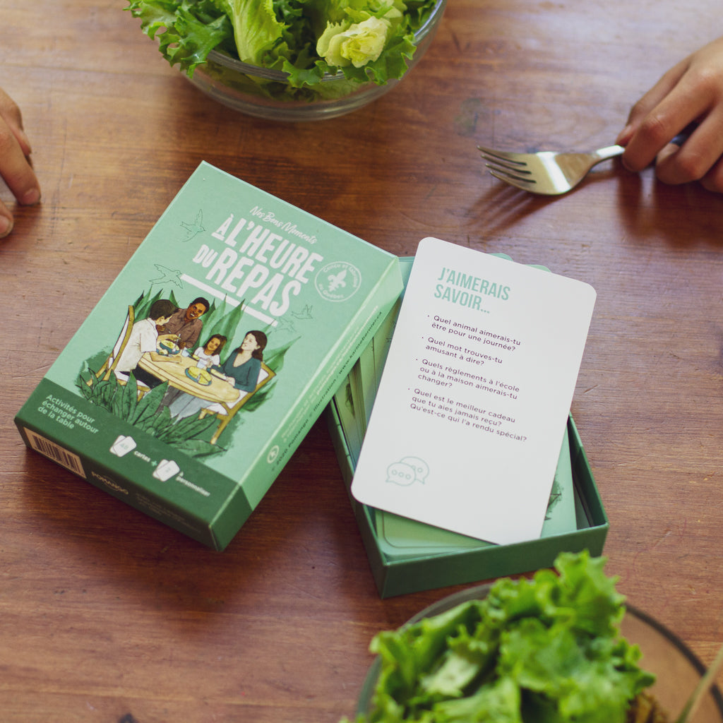 Le jeu Nos Bons Moments-À l'heure du repas offre 48 activités simples et amusantes pour encourager toute la famille à profiter de l’heure des repas. Des questions pour revenir sur la journée, des jeux calmes à faire en mangeant, des sujets de discussions diverses pour animer le repas! But du jeu: Pigez une carte qui déterminera l'activité des prochaines minutes/heures. C'est facile!