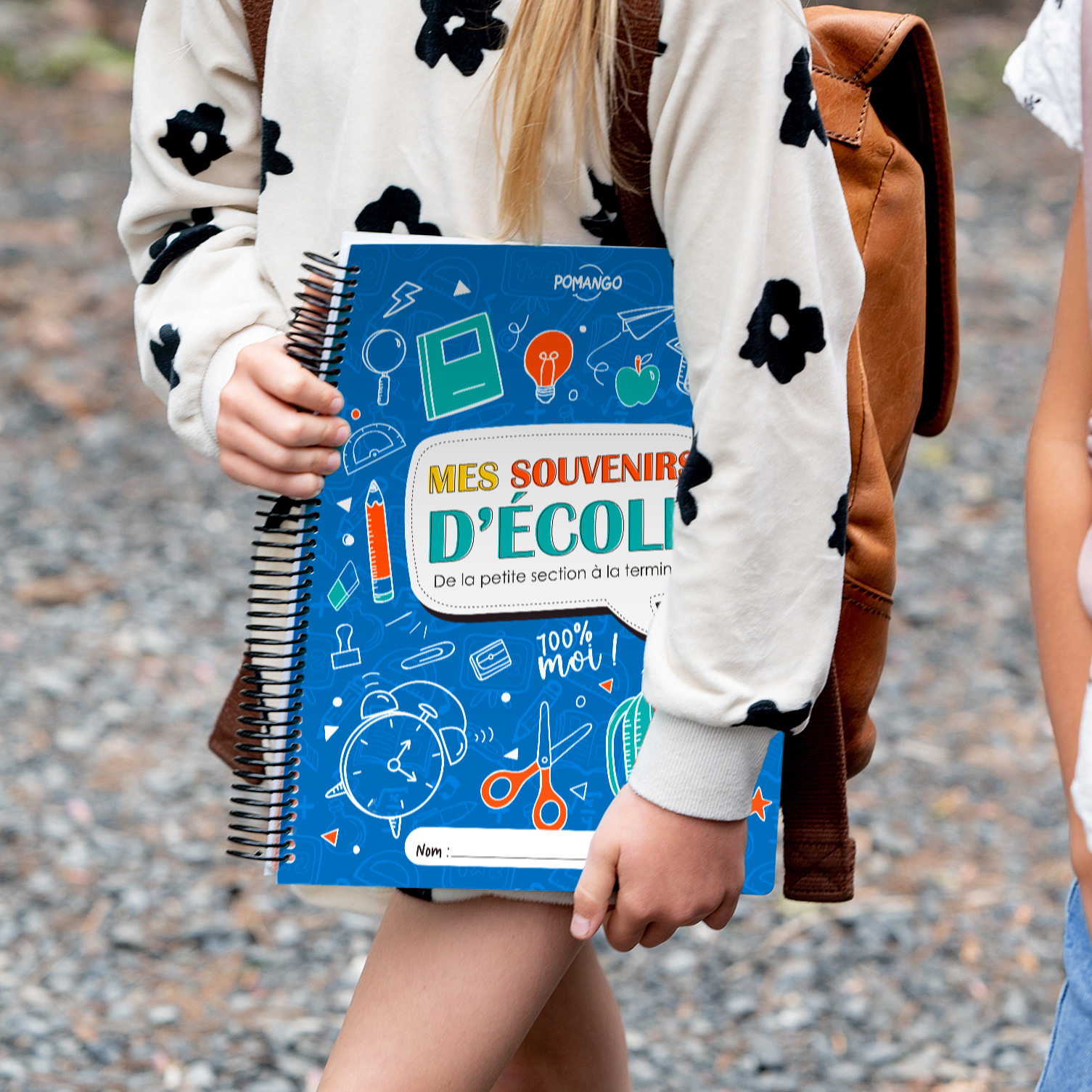 Le cahier Mes souvenirs d'école de Pomango est adapté au système scolaire FRANÇAIS. Il contient une section pour chaque année scolaire, allant de la petite section jusqu'à la Terminale, remplie de questions adressées à l'enfant et munie d'une pochette par année pour conserver tous ses souvenirs (photos, dessins, bulletins, examens marquants, etc.). Chaque année avant le lycée est divisée en 5 catégories.