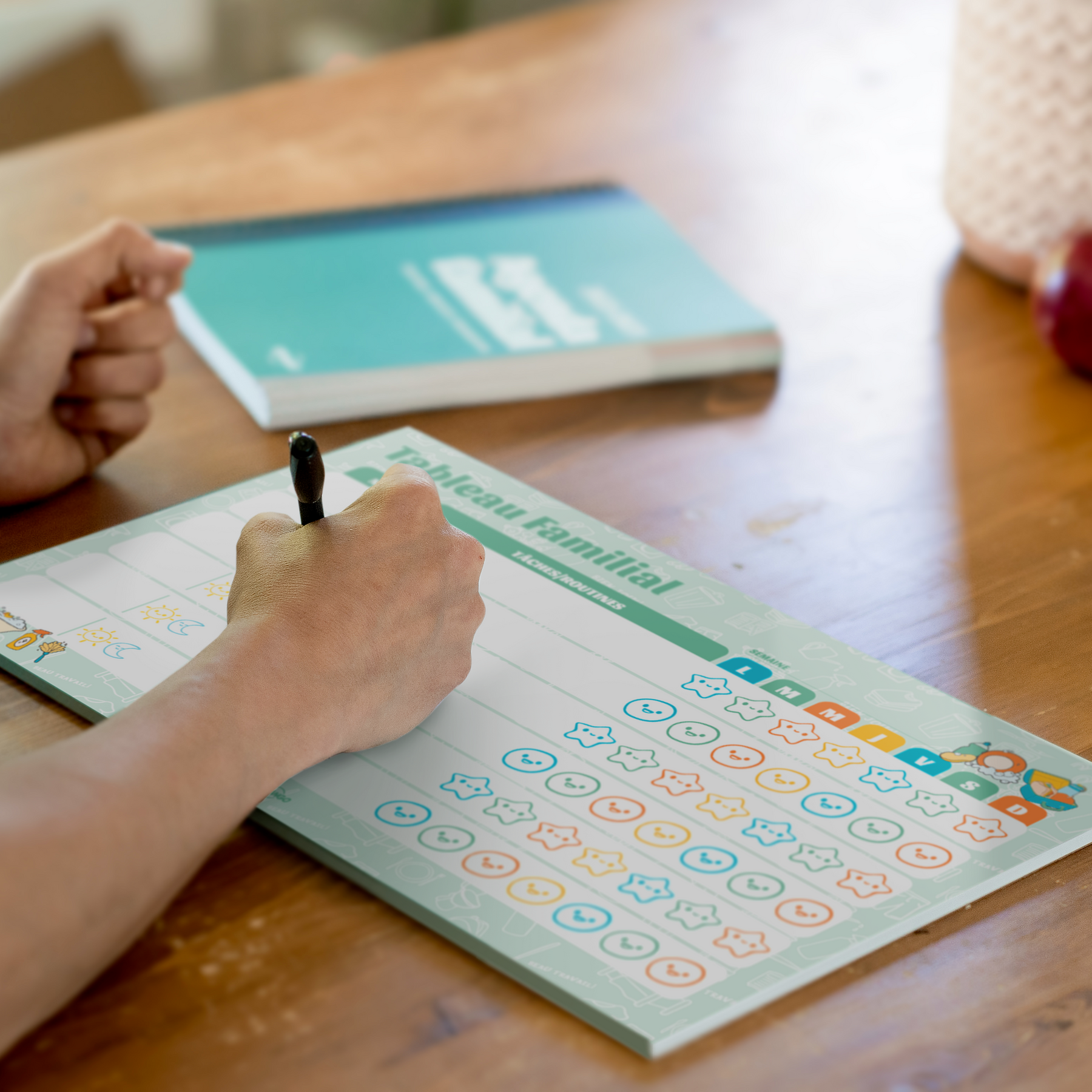 Voici le tout nouveau Tableau Familial de Pomango ! Avec son utilisation simple pour les enfants comprenant repères visuels et concepts épurés, cet outil permettra d’intégrer facilement de nouvelles routines et tâches au quotidien. Avec ses 52 pages (une page par semaine), l’outil accompagnera toute l’année les familles en vue d’un quotidien simplifié !
